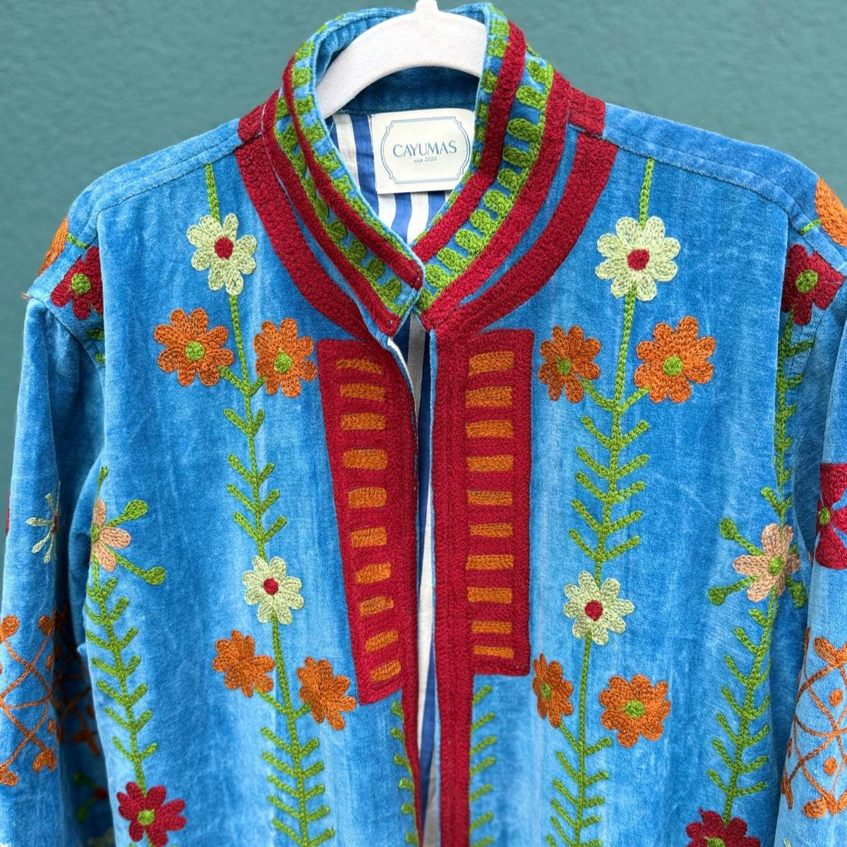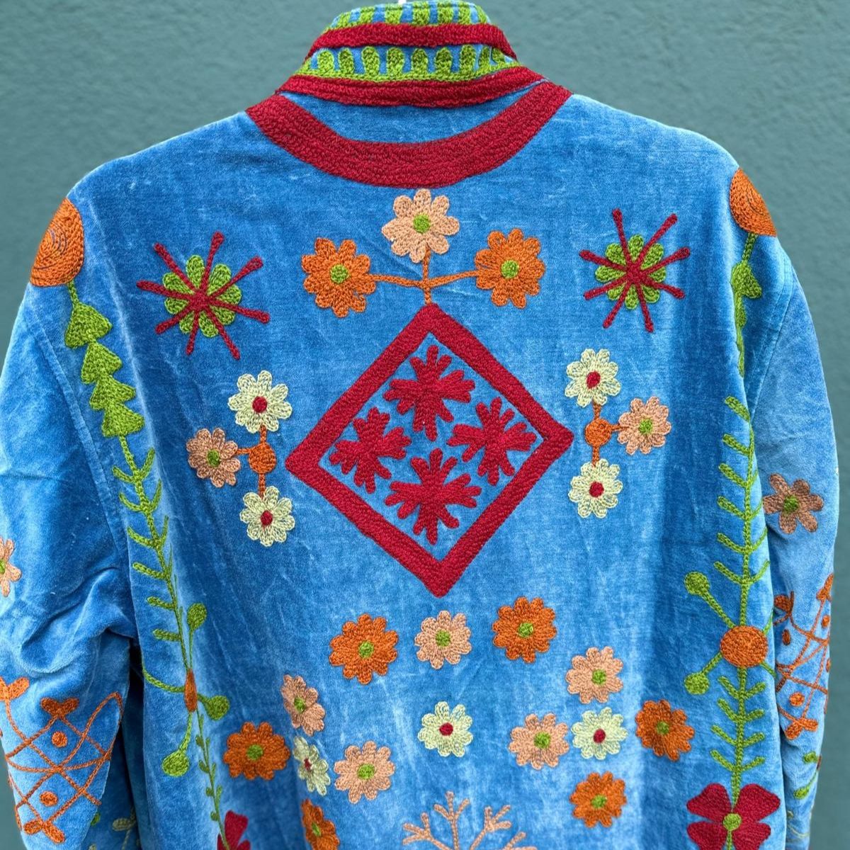 Elegant kimono in luxurious dusty blue cotton velvet, bohemian chic coat style embroidered with Indian fabrics. Reversible to dark blue striped print. Both options combine perfectly with the tones of our Friulian fabrics, highlighting the quality of the craftsmanship.