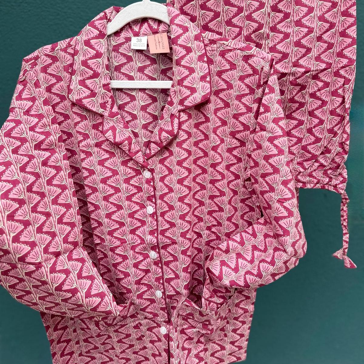 Long cotton pajamas with floral print, handcrafted in India.