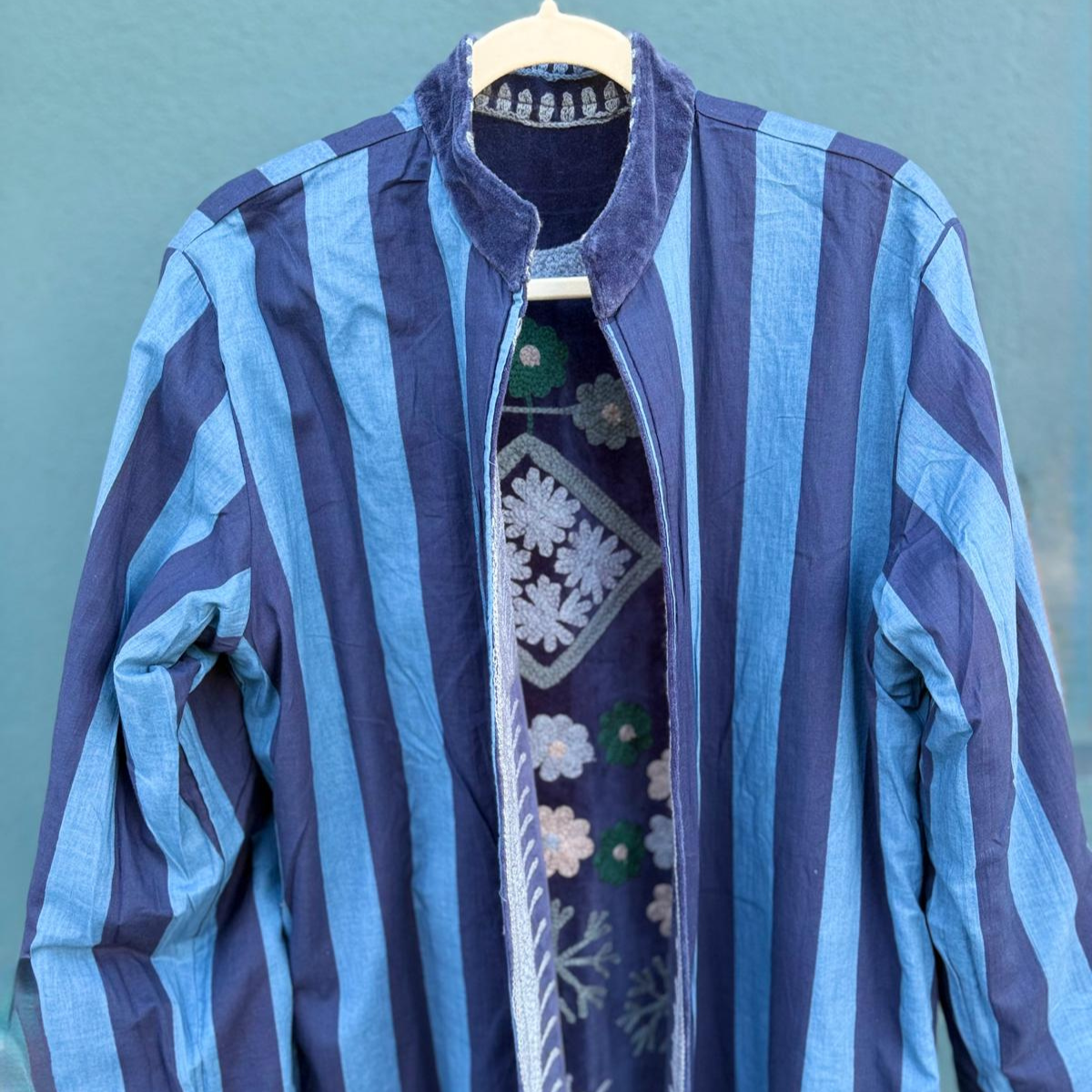Elegant kimono in luxurious cotton velvet in dusty navy blue, bohemian chic coat style embroidered with Indian fabrics. Reversible to light blue and navy blue striped print. Both options combine perfectly with the tones of our Friulian fabrics, highlighting the quality of the craftsmanship.