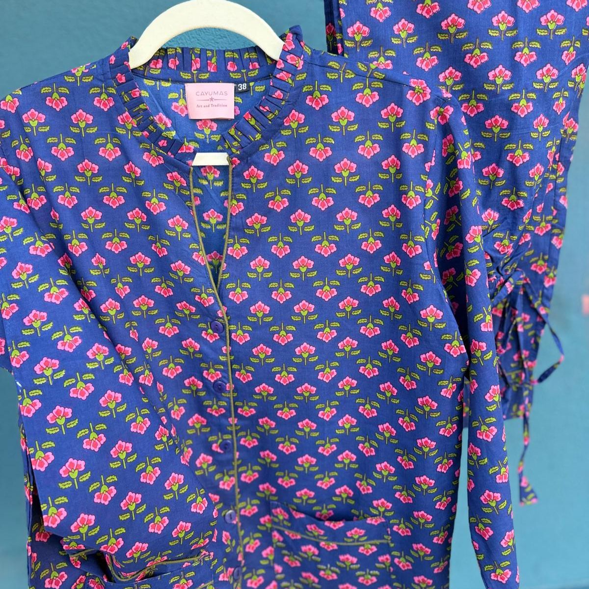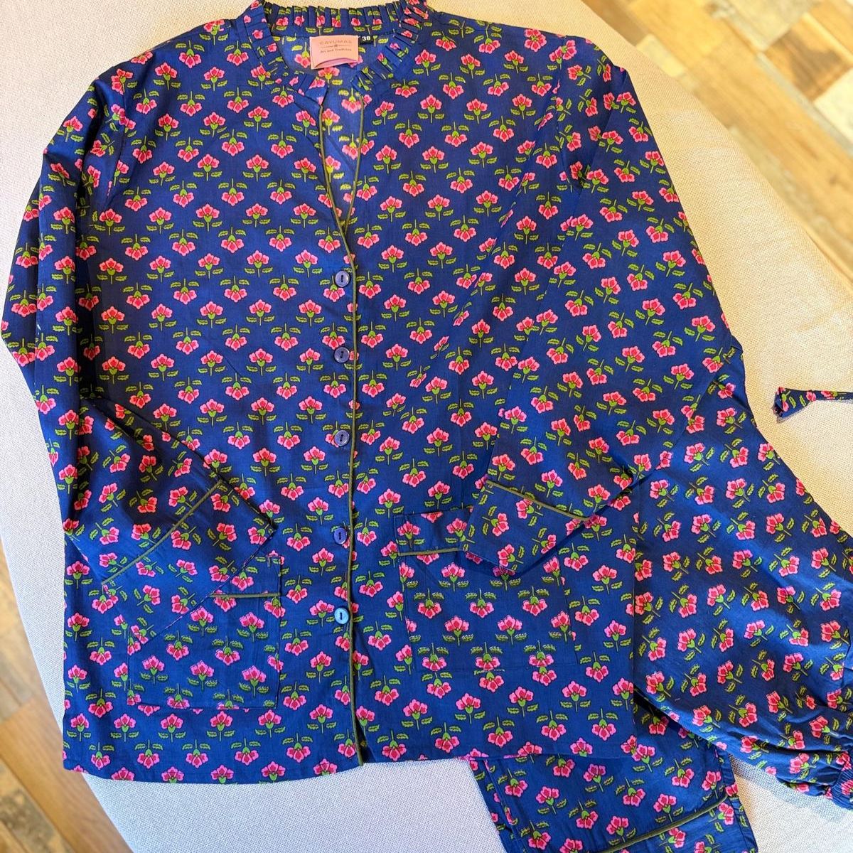 Long cotton pajamas with floral print, handcrafted in India.