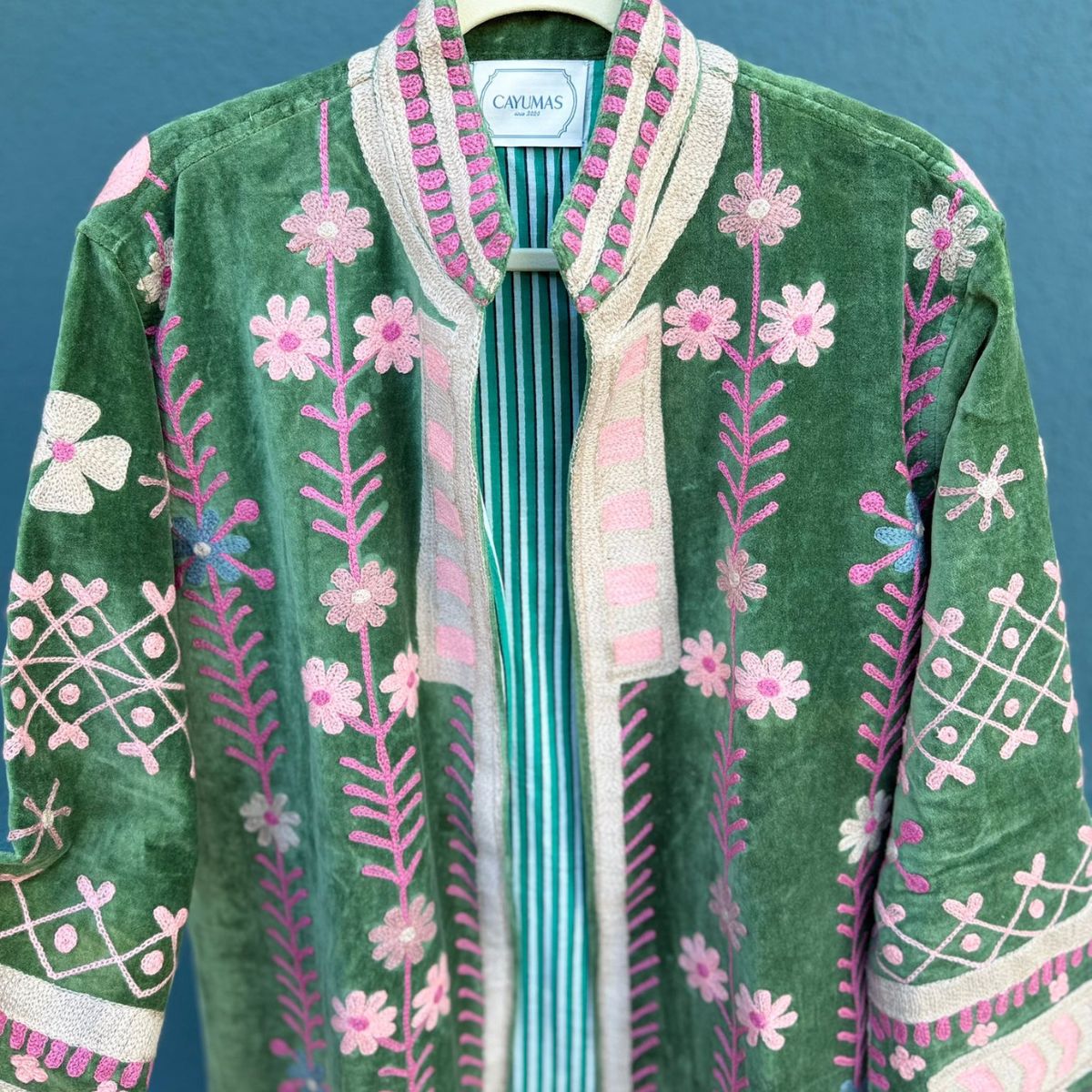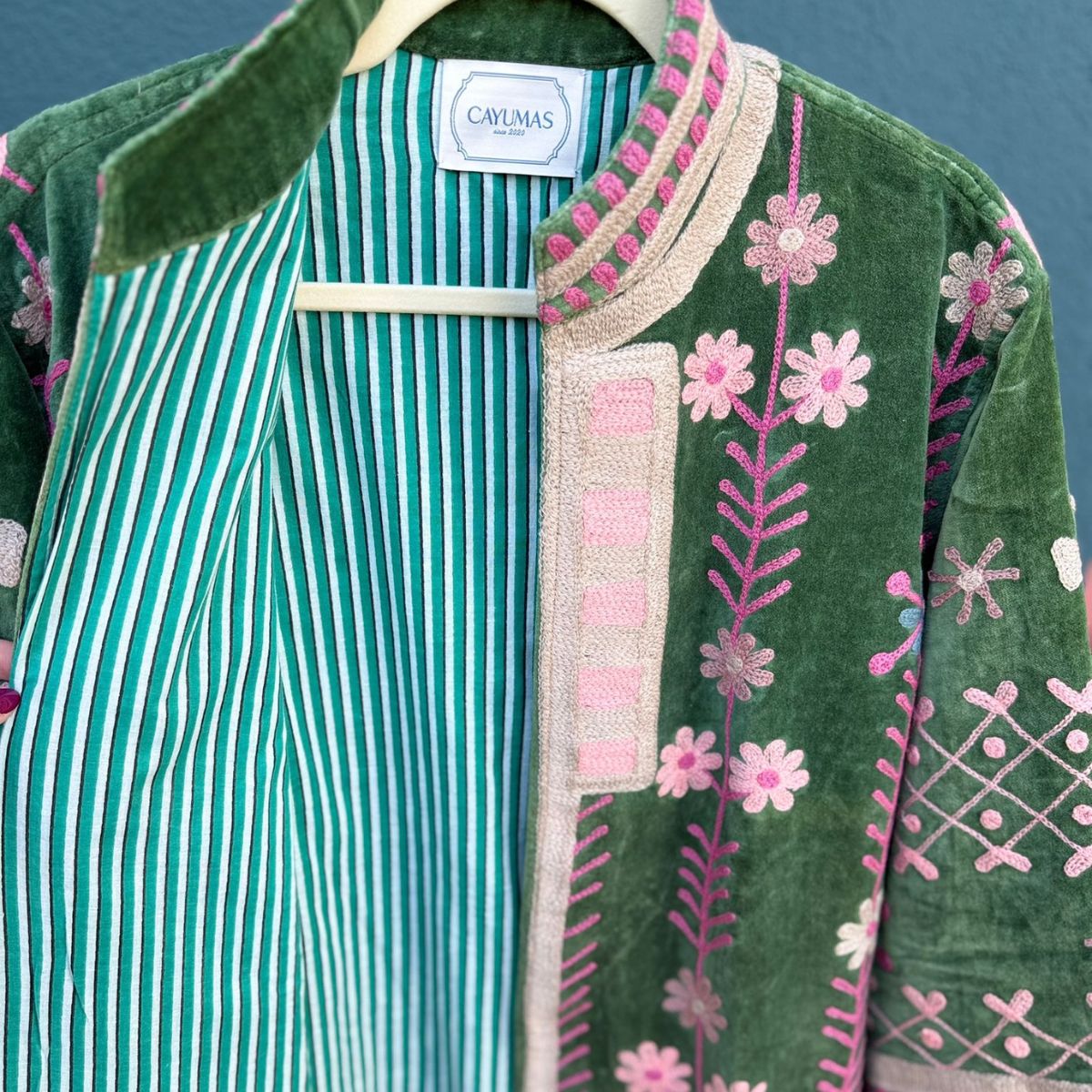 Elegant kimono in luxurious dusty green and pink cotton velvet, bohemian chic coat style embroidered with Indian fabrics. Reversible to green striped print. Both options combine perfectly with the tones of our Friulian fabrics, highlighting the quality of the craftsmanship.