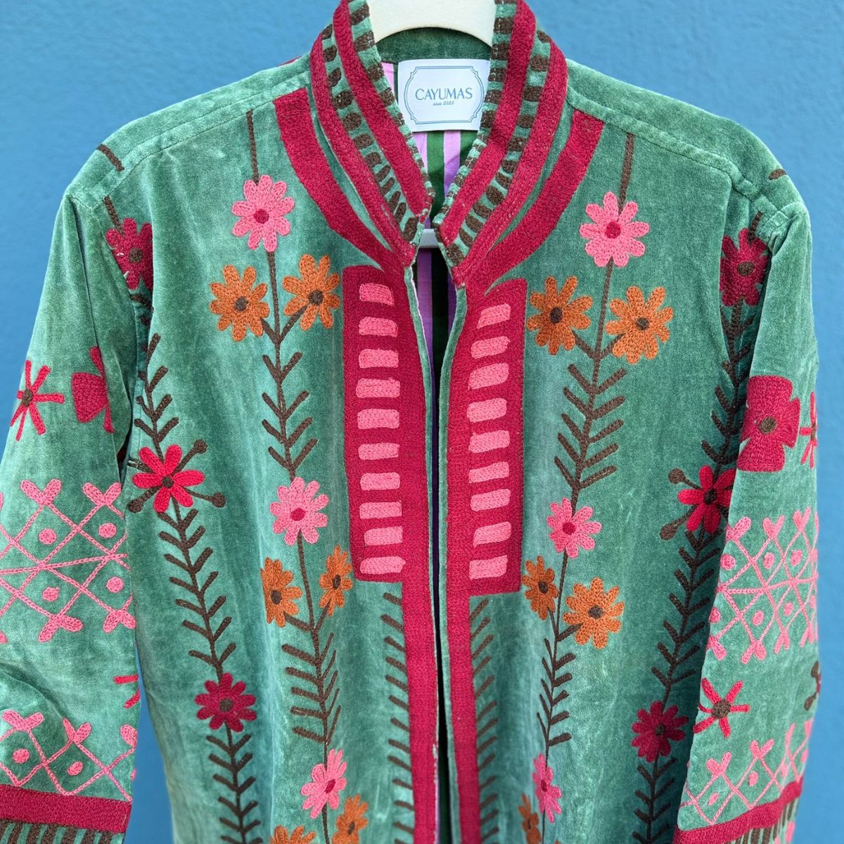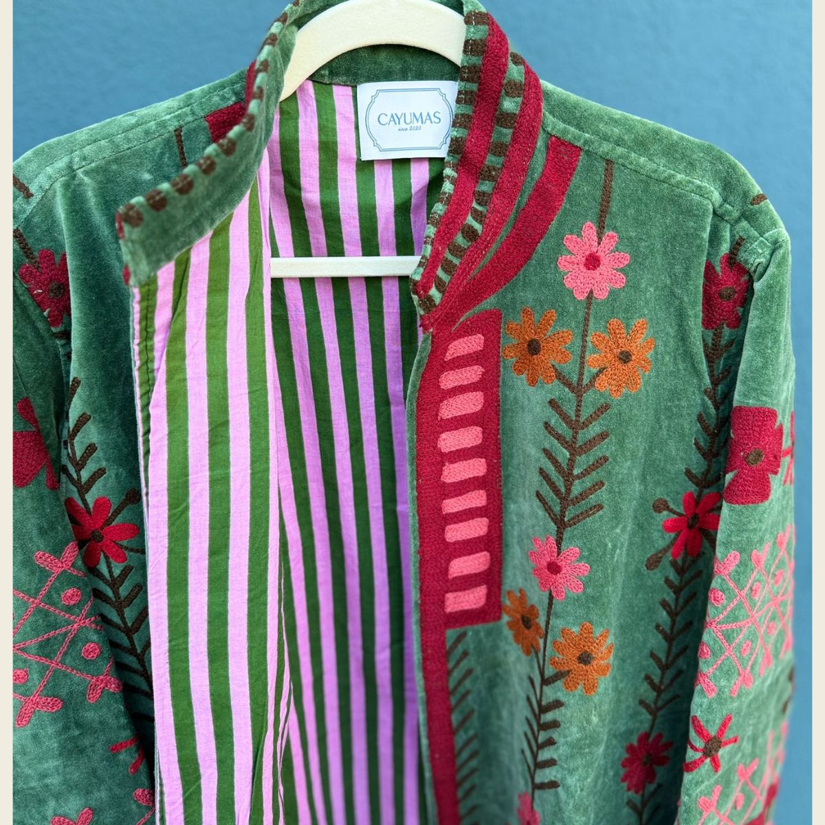 Elegant kimono in luxurious cotton velvet in dusty green, bohemian chic coat style embroidered with Indian fabrics. Reversible to light green and pink striped print. Both options combine perfectly with the tones of our Friulian fabrics, highlighting the quality of the craftsmanship.